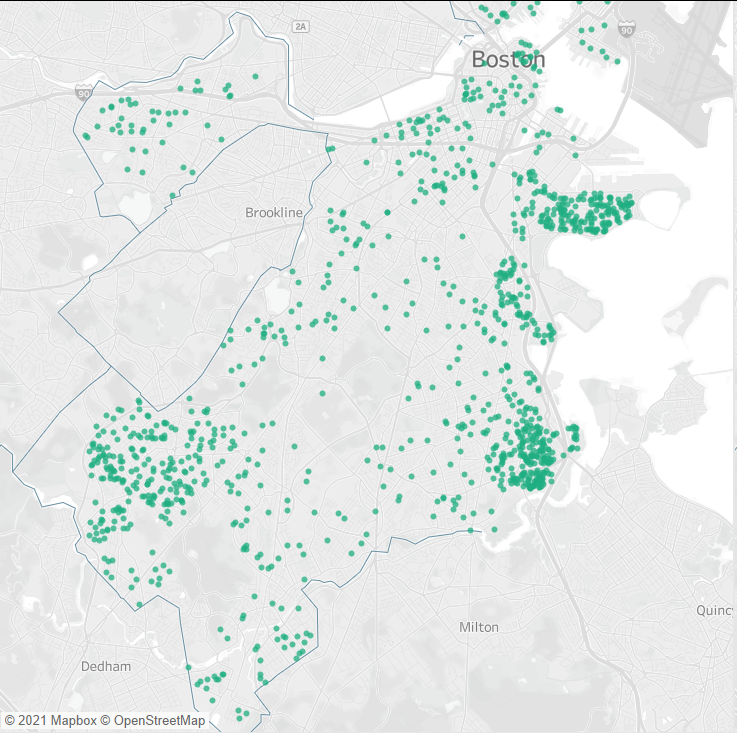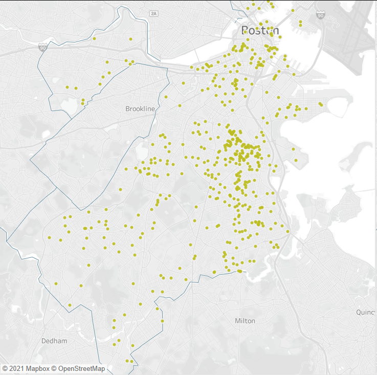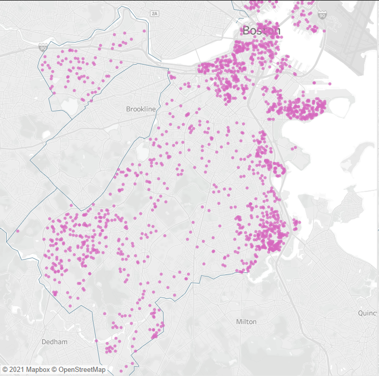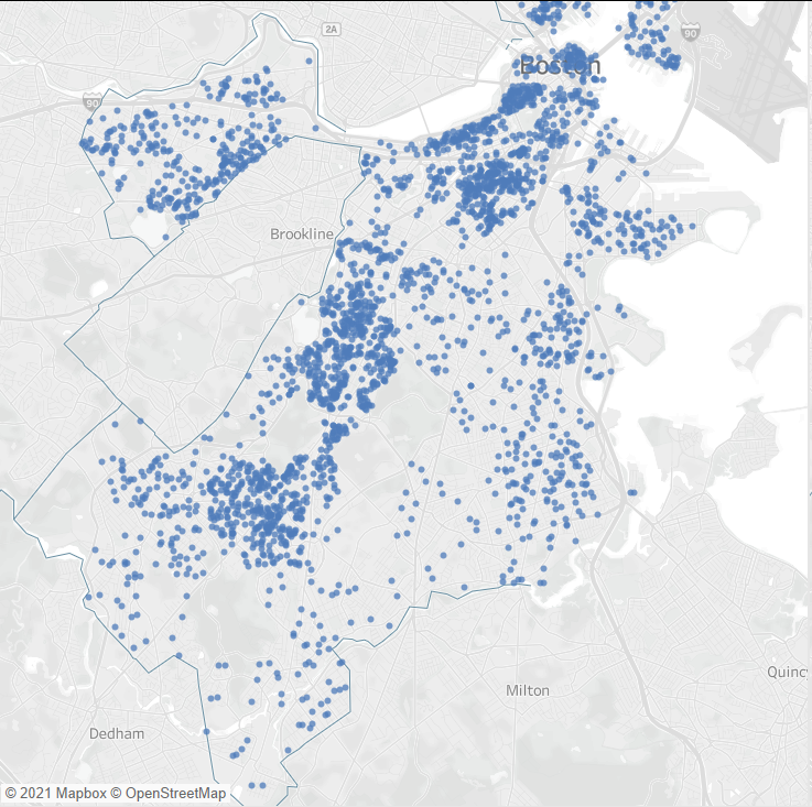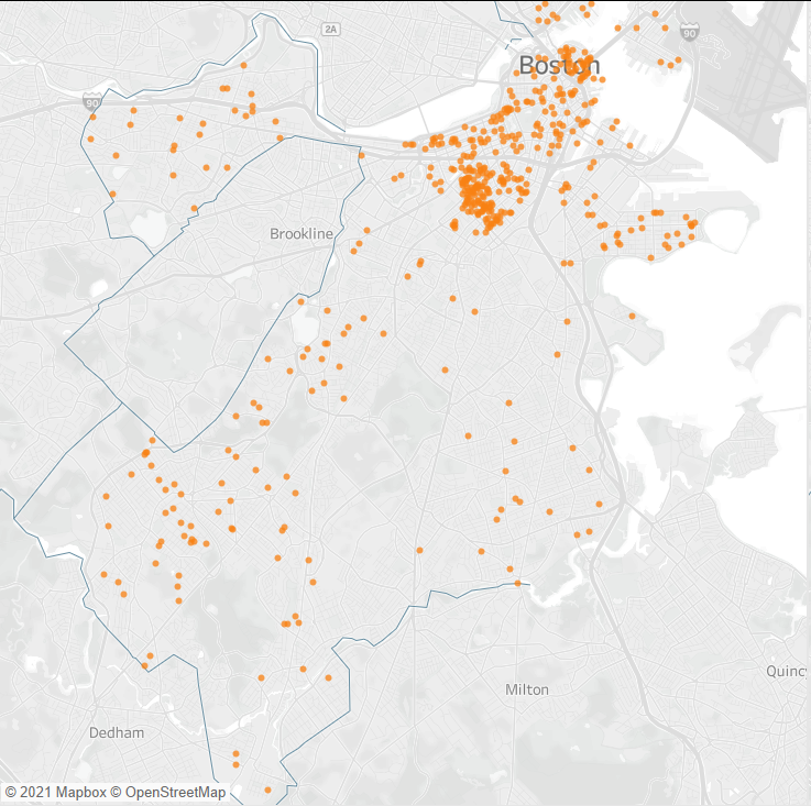 Our control group, you could say, to understand where donors for Mayor Walsh list as their address at the time of donation. Mostly white, mostly affluent and residential neighborhoods – along with strong business community support.